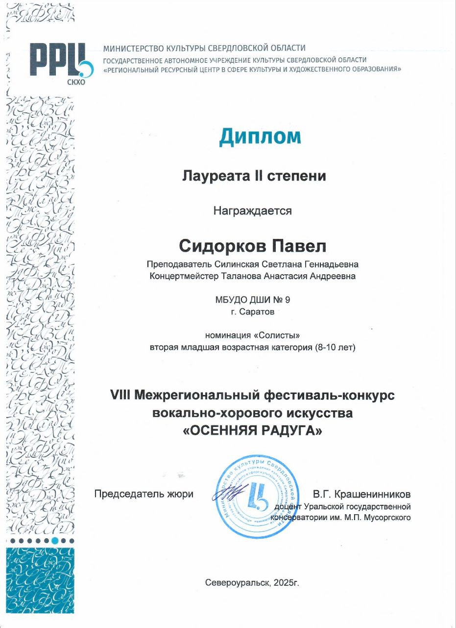 - Павел Сидорков и Мария Краснова (академическое пение, класс преподавателя С.Г. Силинской, концертмейстер А.А. Таланова).