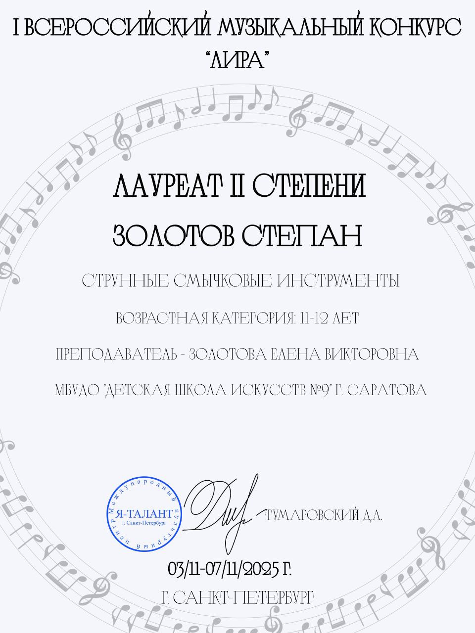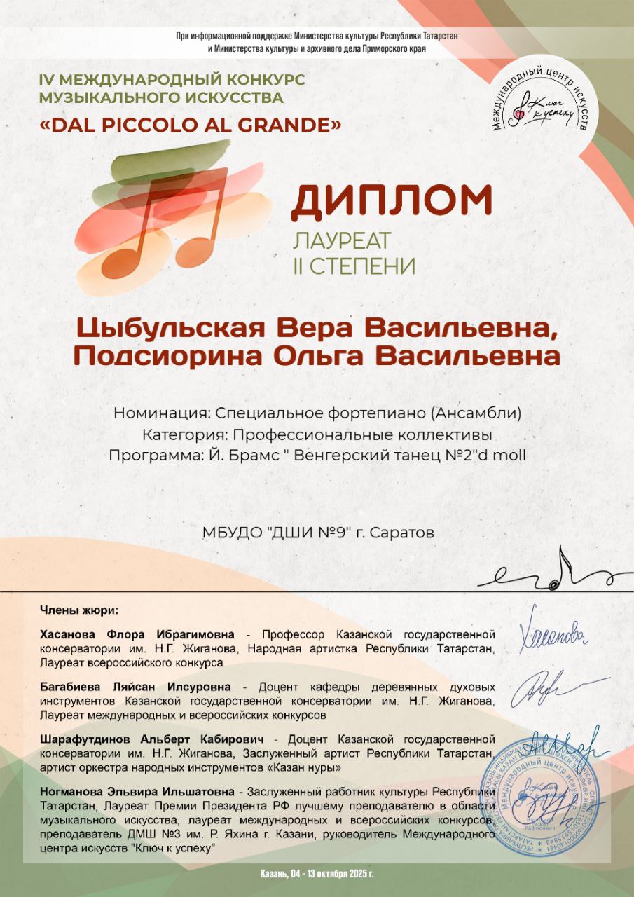 23 -25 октября В этом году фестиваль собрал хоровые коллективы и солистов из Ульяновской, Самарской, Пензенской, Саратовской, Чувашской республики. На протяжении многих лет хоровой фестиваль является площадкой для профессионального общения хоровых коллективов и солистов, дирижеров хормейстеров и преподавателей хоровых дисциплин. Лауреатами нынешнего фестиваля стали двое учащихся нашей школы: Сидорков Павел и Краснова Мария (класс преподавателя академического пения Силинской С. Г.., концертмейстер Таланова А. А.) Дипломом "Лучший концертмейстер" отмечена преподаватель Таланова А. А. Поздравляем учащихся, а также преподавателя Светлану Геннадьевну и концертмейстера Анастасию Андреевну с очередной наградой и желаем дальнейших творческих успехов! С 4 по 13 октября Учредителем конкурса является Международный центр искусств «Ключ к успеху» (г. Казань) при информационной поддержке Министерства культуры Республики Татарстан. От нашей школы достойно выступили преподаватели отделения фортепиано Цыбульская Вера Васильевна и Подсиорина Ольга Васильевна. По результатам конкурса в номинации «Специальное фортепиано (Ансамбли) наши преподаватели получили Диплом Лауреата II степени. Мы поздравляем Веру Васильевну и Ольгу Васильевну с отличным результатом и желаем дальнейших творческих побед. 29 октября Ярким событием в преддверии золотой поры стал концерт учащихся нашей школы, посвященный осеннему празднику «Золотая осень». Это мероприятие объединило детей разных возрастов, создав атмосферу радости, творчества и доброты. Концерт начался с приветствия юных музыкантов, исполненных прекрасных мелодий на скрипке, фортепиано и гитаре. Под руководством опытных педагогов ребята представили зрителям небольшие музыкальные номера, раскрывающие красоту природы осенью. Ребята старшей и подготовительной группы детского сада также проявили активность, приняв участие в веселых конкурсах и викторинах. Воспитанники увлеченно соревновались в ловкости и смекалке, весело выполняя задания ведущего. Особым интересом пользовались игры, направленные на развитие внимания и памяти, такие как конкурс загадок и ребусов. Мероприятие стало настоящим подарком для воспитанников детского сада, познакомив их с красотой музыкального искусства и обогатив культурный досуг. 22 октября Это важное событие знаменует собой первый важный шаг ребят в мир музыки и искусства, открывая перед ними новые горизонты творчества и вдохновения. Особое внимание заслужили сами первоклашки. Они проявляли активность и увлеченность, охотно участвуя в конкурсах и викторинах. Ведущие задавали ребятам музыкальные загадки и вопросы, на которые юные музыканты уверенно давали правильные ответы, вызывая восхищение педагогов и родителей. Самым волнующим моментом стала церемония принятия клятвы первоклассника. Дети произнесли обещания бережно относиться к инструментам, уважительно общаться друг с другом и стремиться к творческим достижениям. После произнесения клятвы каждому ребенку торжественно вручили памятные значки «Первоклассника». Учащиеся исполнили для родителей этюды технической и концертной направленности, постарались показать все штрихи и технические приёмы, которые освоили за время обучения. Перед концертом преподаватель Золотова Е. В. провела беседу с род