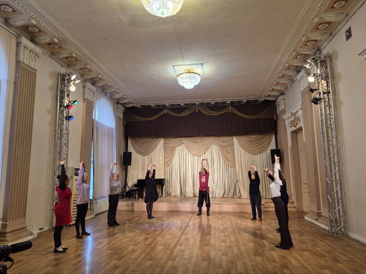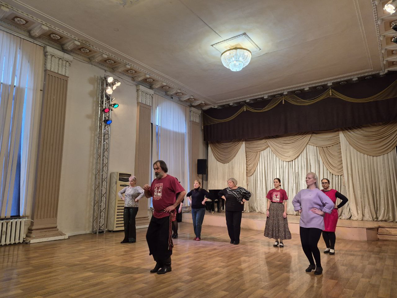 Первое занятие было посвящено основам традиционного хореографического искусства региона: изучались базовые этапы обучения народному танцу, осваивались специальные техники исполнения движений («проходки», «дроби»), разучивались композиции круговых и линейных бытовых танцев, а также первая и вторая фигура популярной духовной кадрили «Духовницкая».