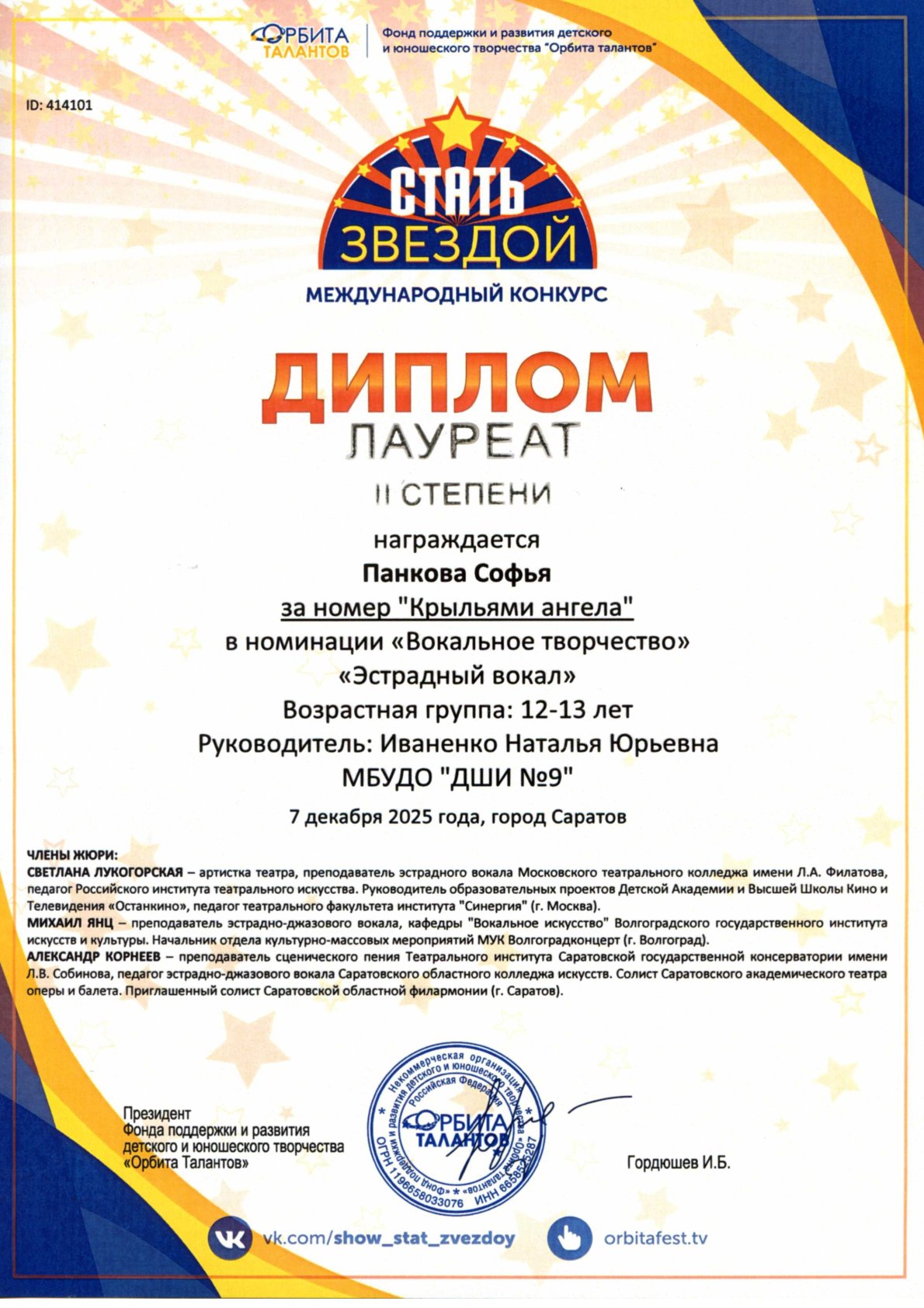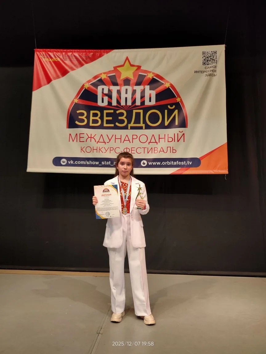 Проходил Международный конкурс-фестиваль"Энергия звёзд ". Преподаватель Иваненко Наталья Юрьевна. Учащаяся 5 класса эстрадный вокал Панкова Софья - Лауреат 2 степени.