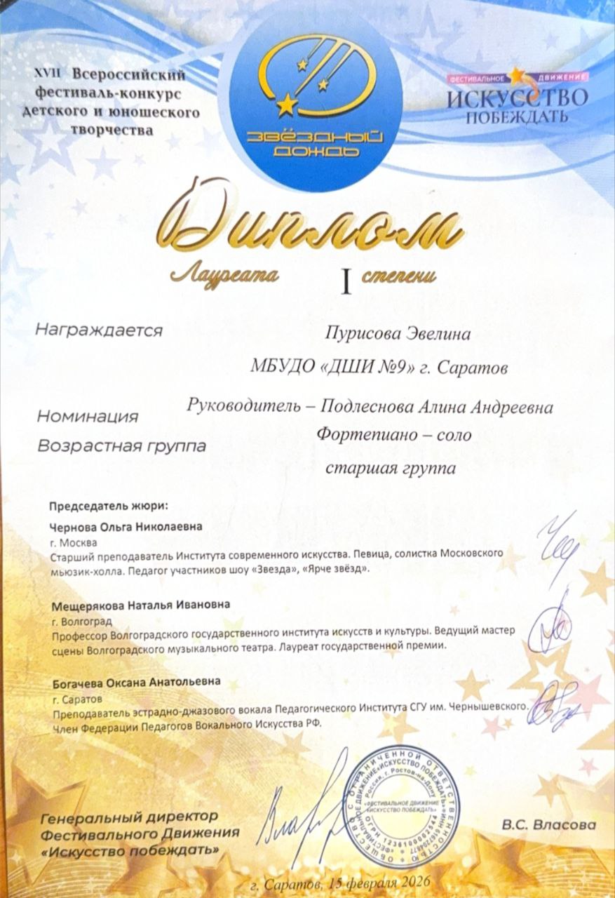 Пурисова Эвелина - Диплом Лауреата I степени;