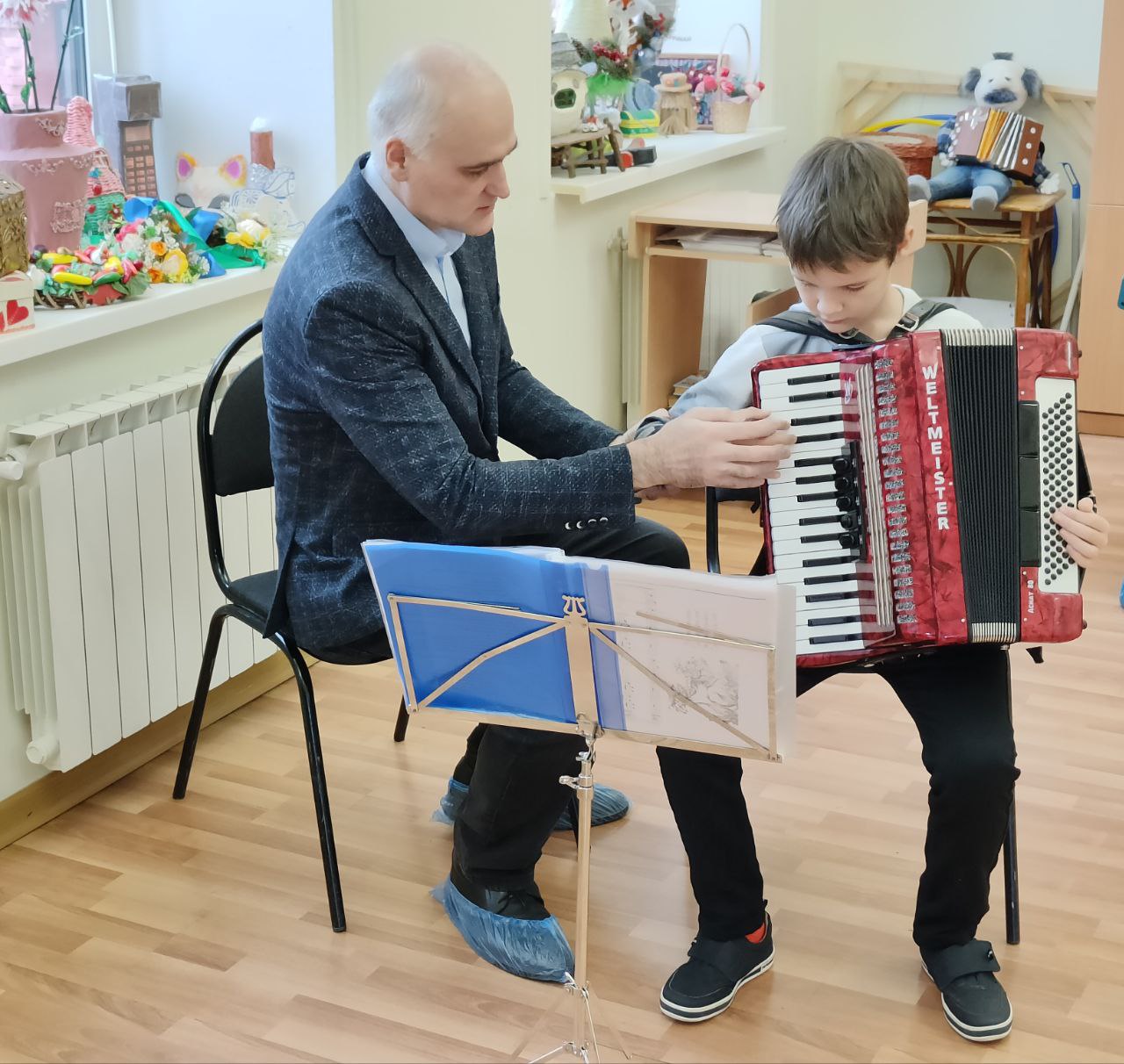 Преподаватель, председатель цикловой комиссии «Инструменты народного оркестра» Павел Рафикович Мангасарян провёл занятие совместно с учеником 1 класса Николаем Подгорновым (класс преподавателя Черненко Ю.К.).