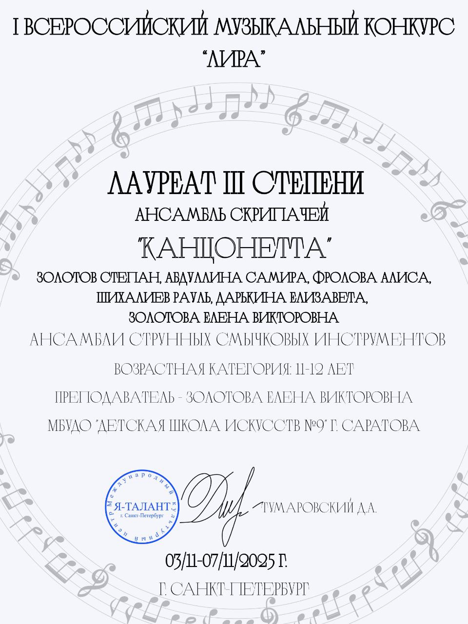 ансамбль скрипачей «Канцонетта» - Диплом Лауреата III степени